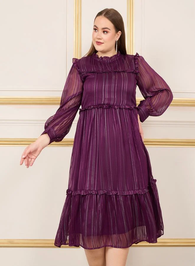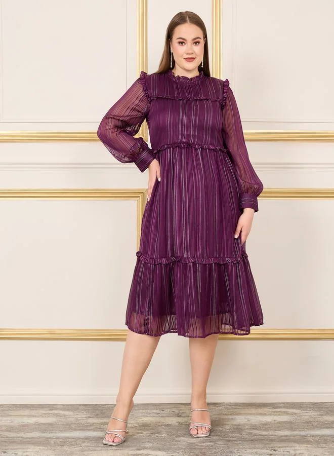 Styli Plus Lurex Striped Frill Detail High Neck A-Line Midi Dress