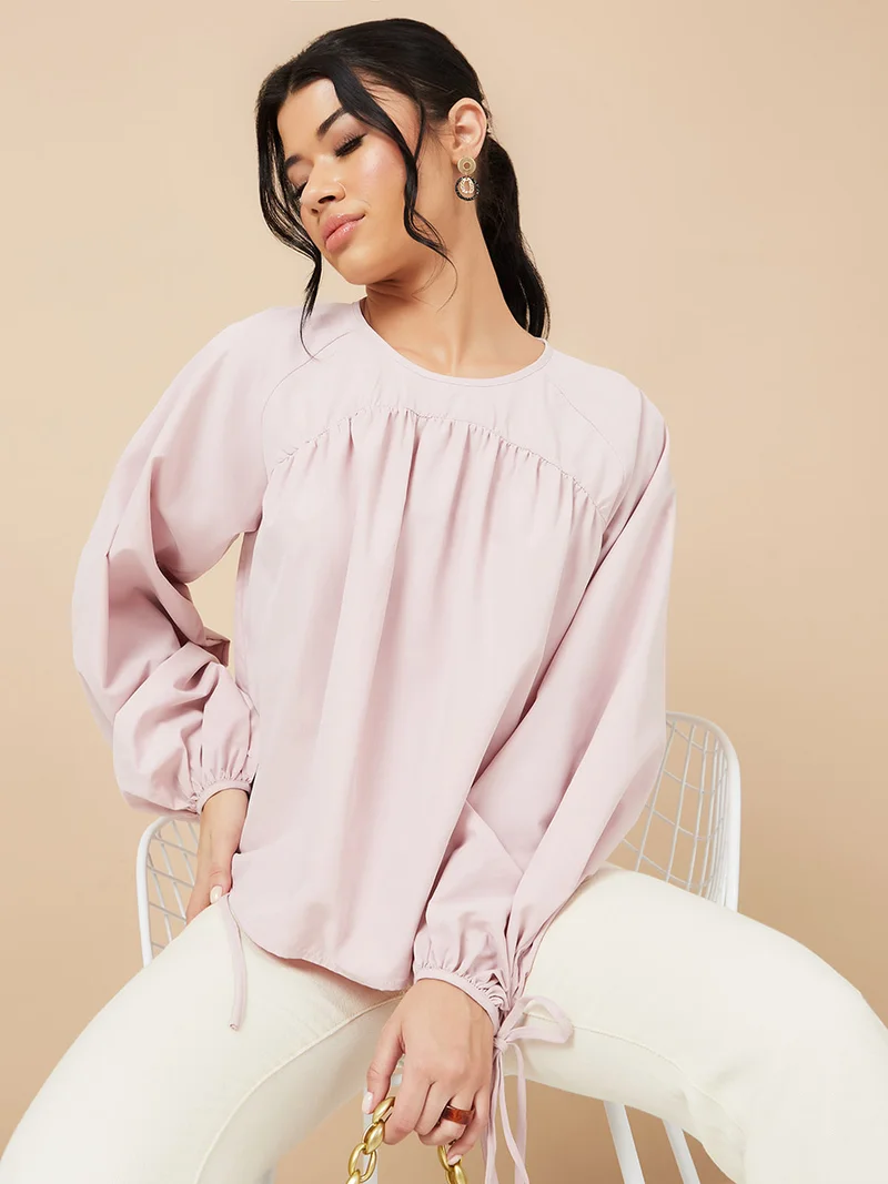 Tie Cuff Balloon Sleeves Round Neck Top