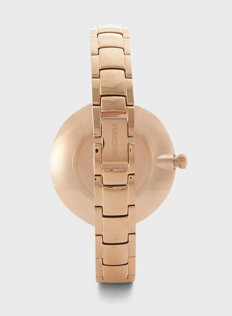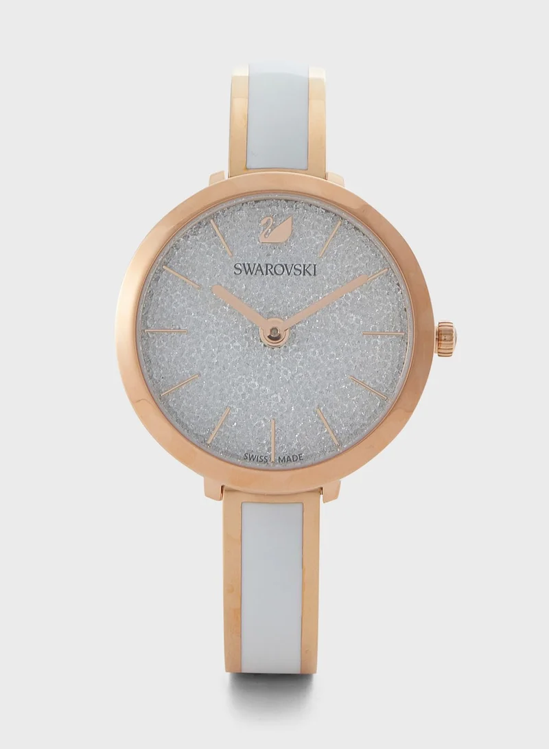 Effortlessly chic, this easy-to-wear Swarovski bangle watch is infused with iconic Crystalline sparkle. Its modern dial and elegant rose-gold tone PVD coated stainless steel case, filled with approximately 1,000 clear crystals, shimmers with fresh brilliance. The jewelry-inspired bangle, also crafted in rose-gold tone PVD coated stainless steel, is finished with a minimalist design in lustrous white enamel. A perfect accessory to style this season and beyond, the watch is made in Switzerland and water resistant to 50m. Adjustable links ensure it will fit any wrist size.