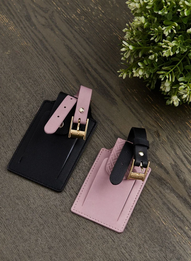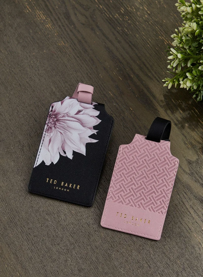 Travel in style with this stunning vegan leather luggage tag set from Ted Baker complete with the floral ‘Clove’ design. The tags have an opening at the top for putting an ID card in and secure onto your bag or suitcase with a gold buckle fastening. The larger tag features a black background with a scattering soft dahlia flowers, and the smaller pink tag is lightly embossed with a geometric pattern. Presented in a matching box, this set is the ideal accessory and the perfect gift for anyone going on holiday, travelling of off on a weekend away.