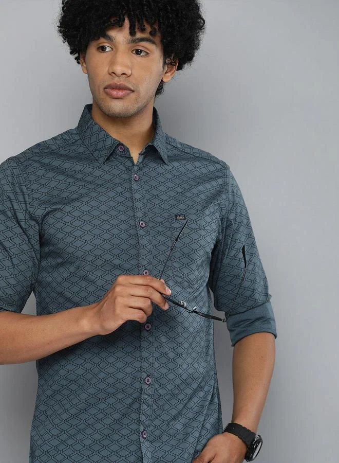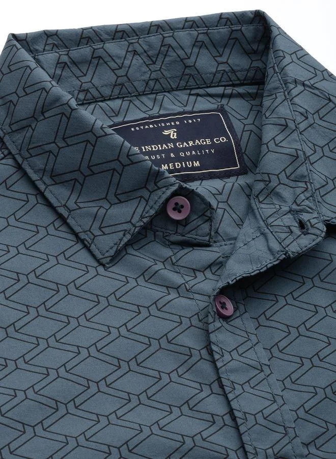 The Indian Garage Co Men Charcoal Printed Spread Collar Shirt