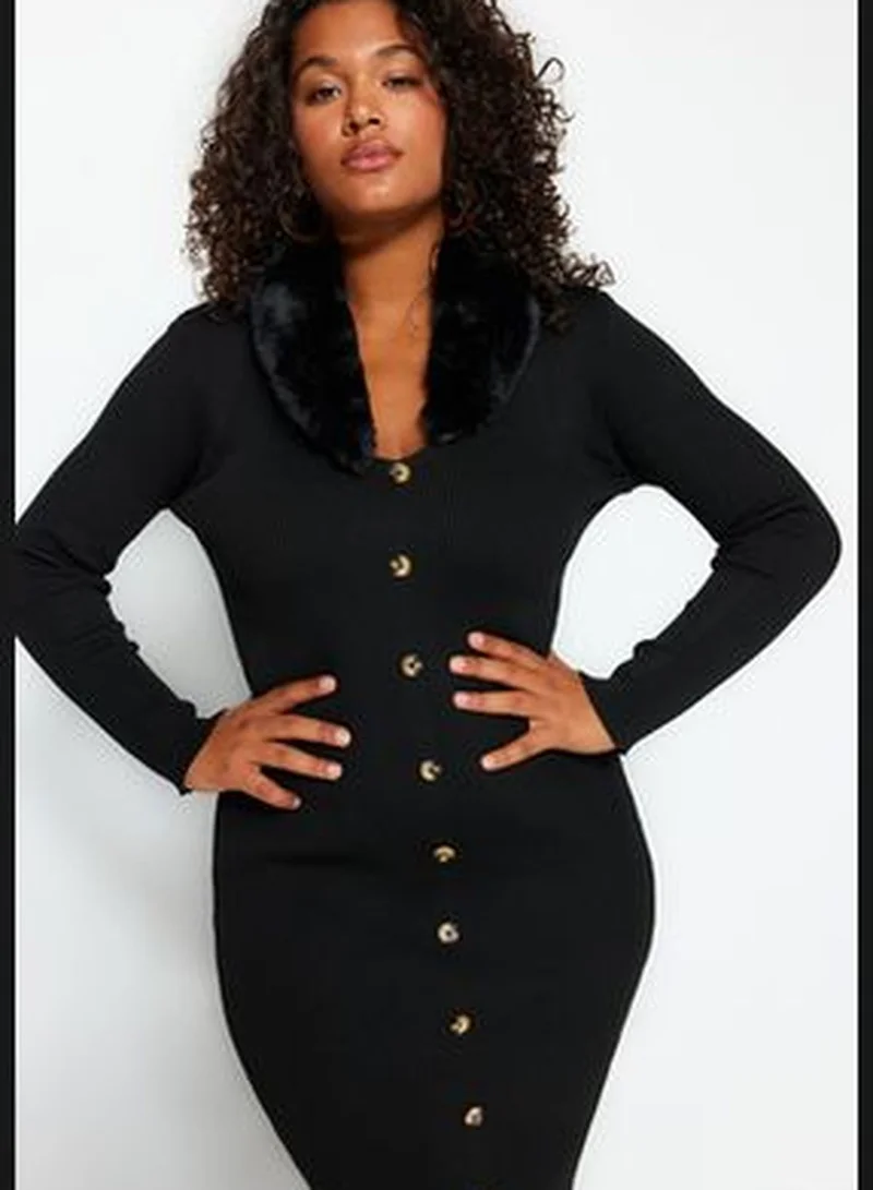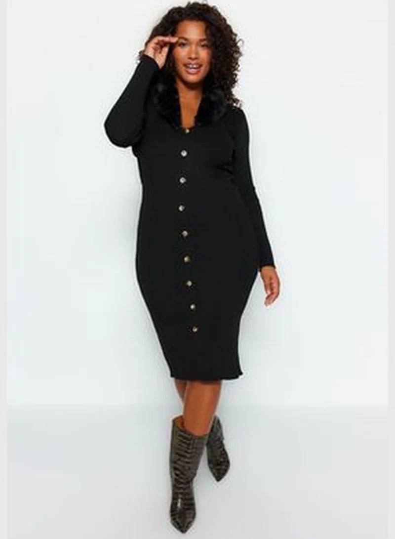 This long-sleeve, black midi dress features a faux fur collar and a line of gold buttons down the center. The fitted silhouette is sleek and stylish.