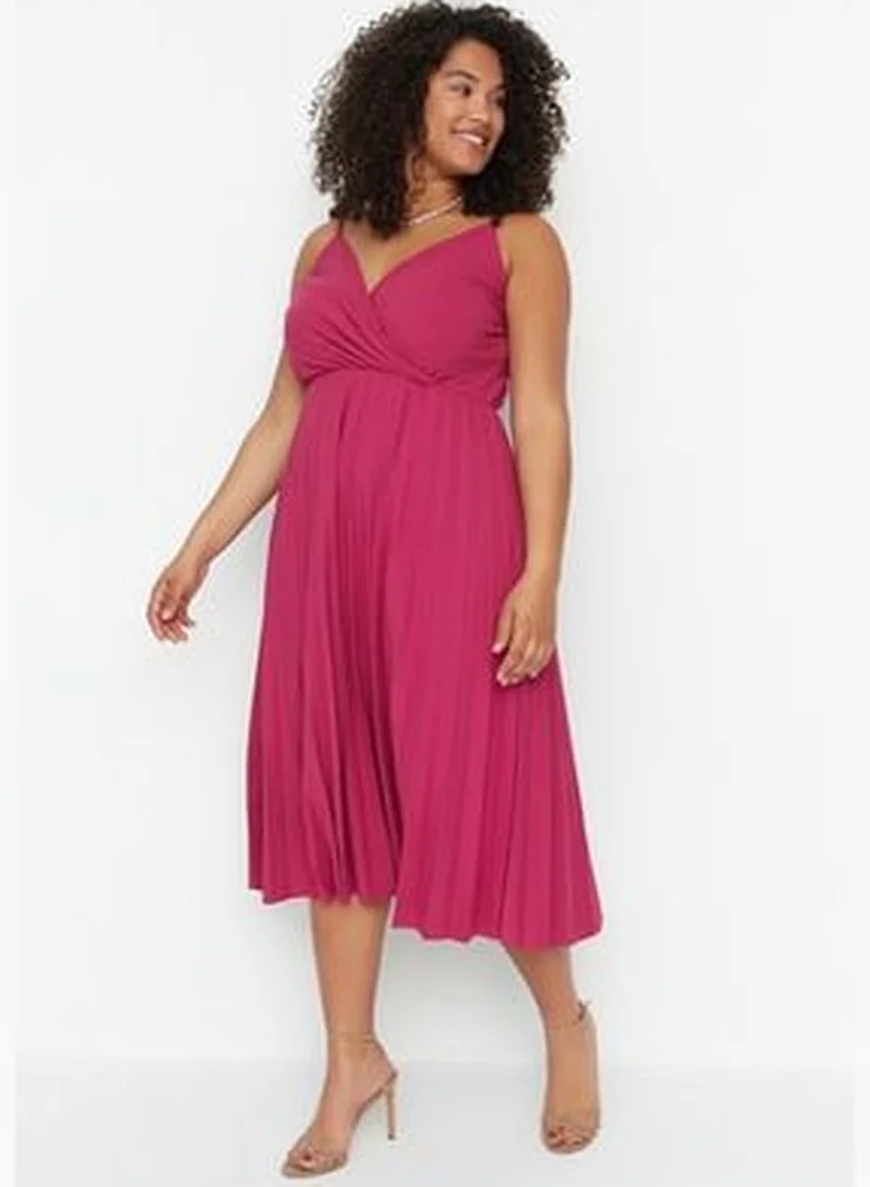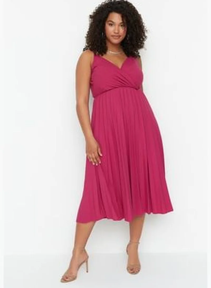 This magenta dress features a v-neckline with delicate straps and a pleated skirt that falls to a midi length, offering a refined and flattering silhouette.