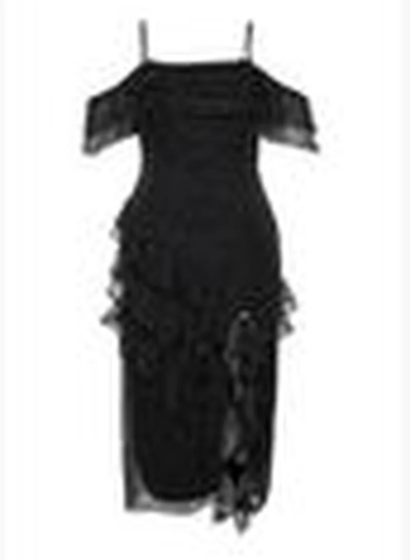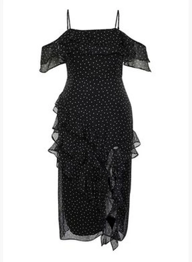 This black dress features an all-over polka dot print, a ruffle trim, and spaghetti straps. Its off-the-shoulder design offers an elegant and breezy style.