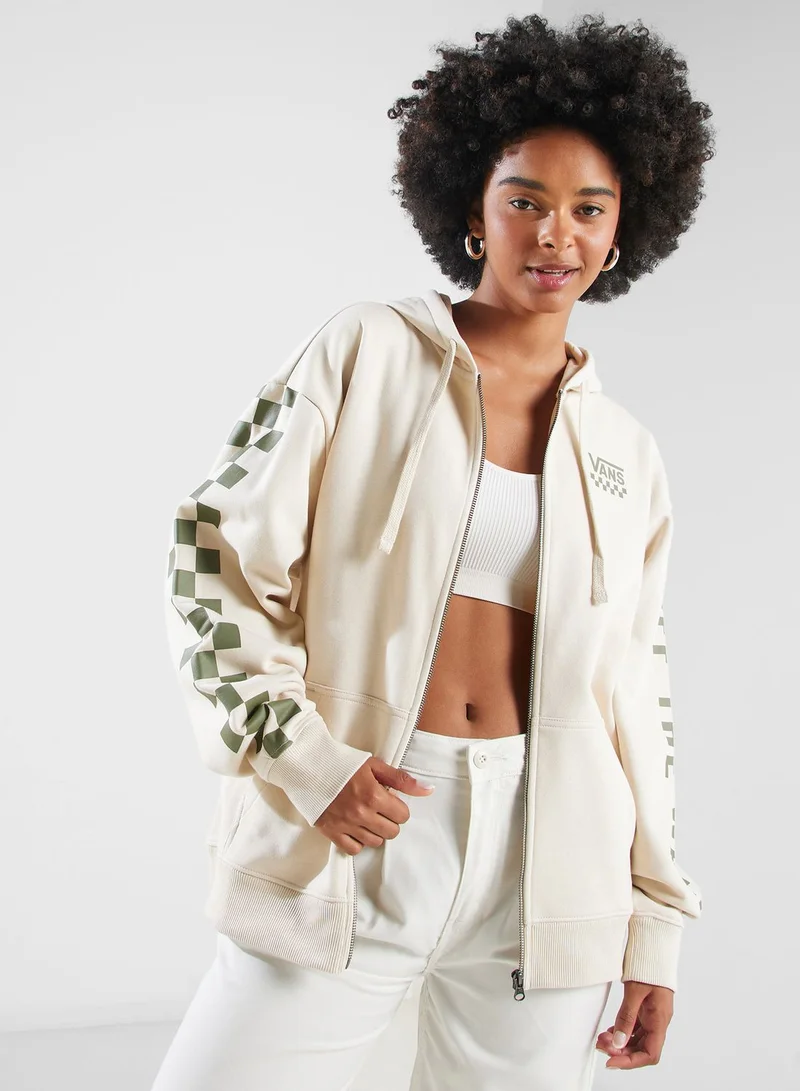 The Vans Extra Fun Oversized Full Zip Hoodie has long sleeves with a checkerboard print and the Vans Off the Wall logo