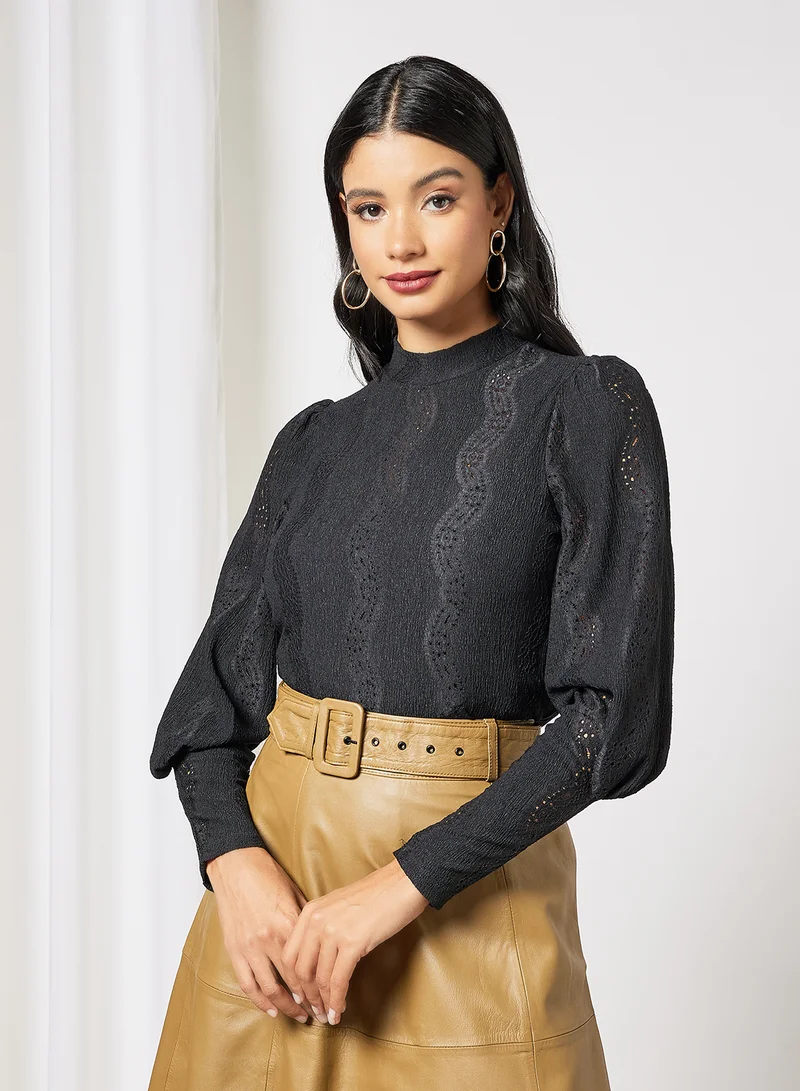 Y.A.S Broderie Anglaise High Neck Top Black
