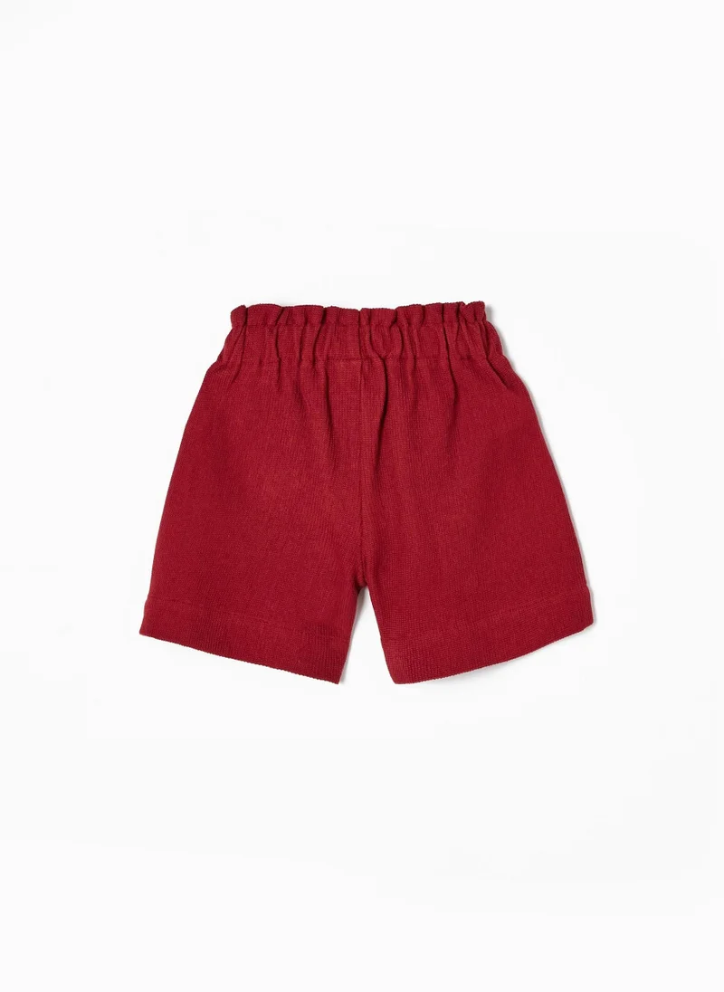 Dark Red Shorts For Girls, With Paperbag Waistband And Decorative Bow. Made Of A Cotton Blend Fabric With Texture