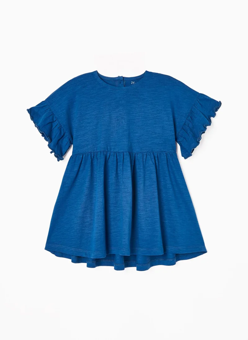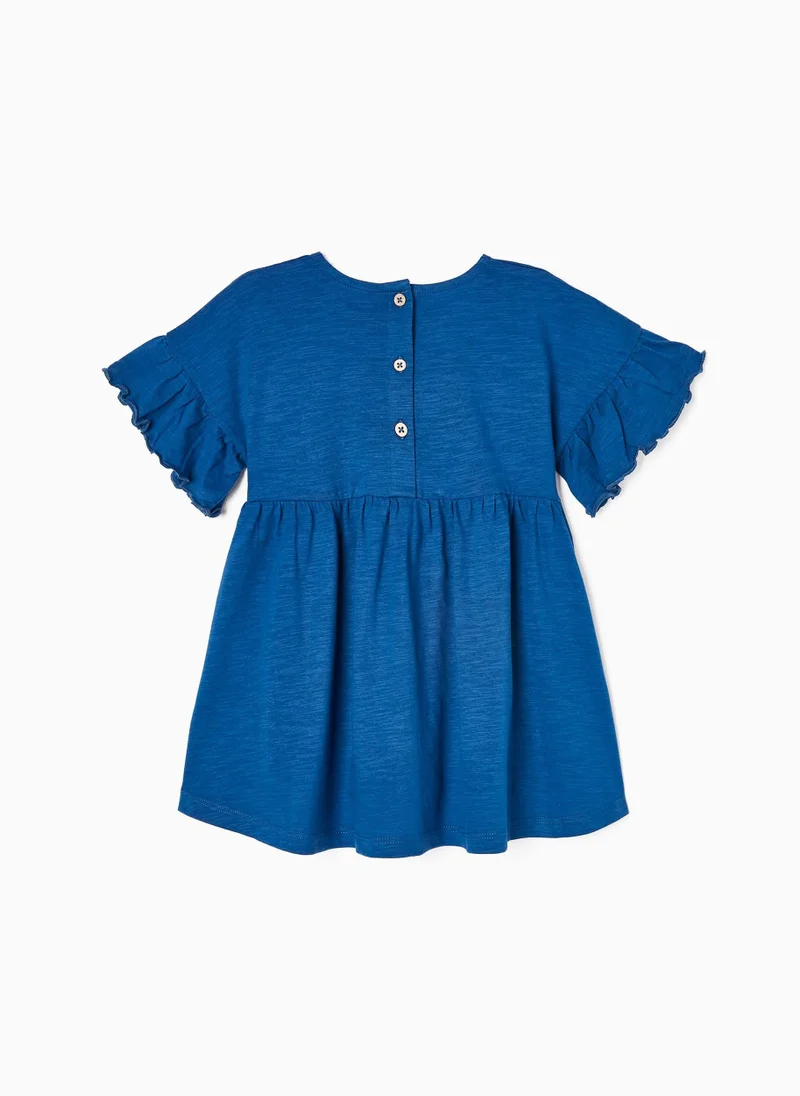 Blue short sleeve t-shirt for girls, in 100% cotton jersey. Drop shoulders with ruffled sleeves. Frilly waist. Asymmetric bottom, slightly longer at the back, with evasé effect. Coconut buttons at the back for easy dressing.