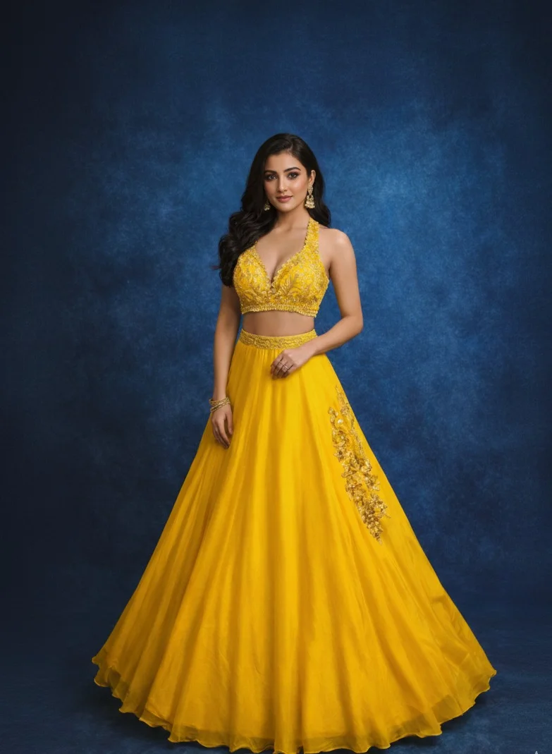 Mustard Yellow Georgette Lehenga Choli Set with Intricate Gold Embroidery and Floral Appliqué