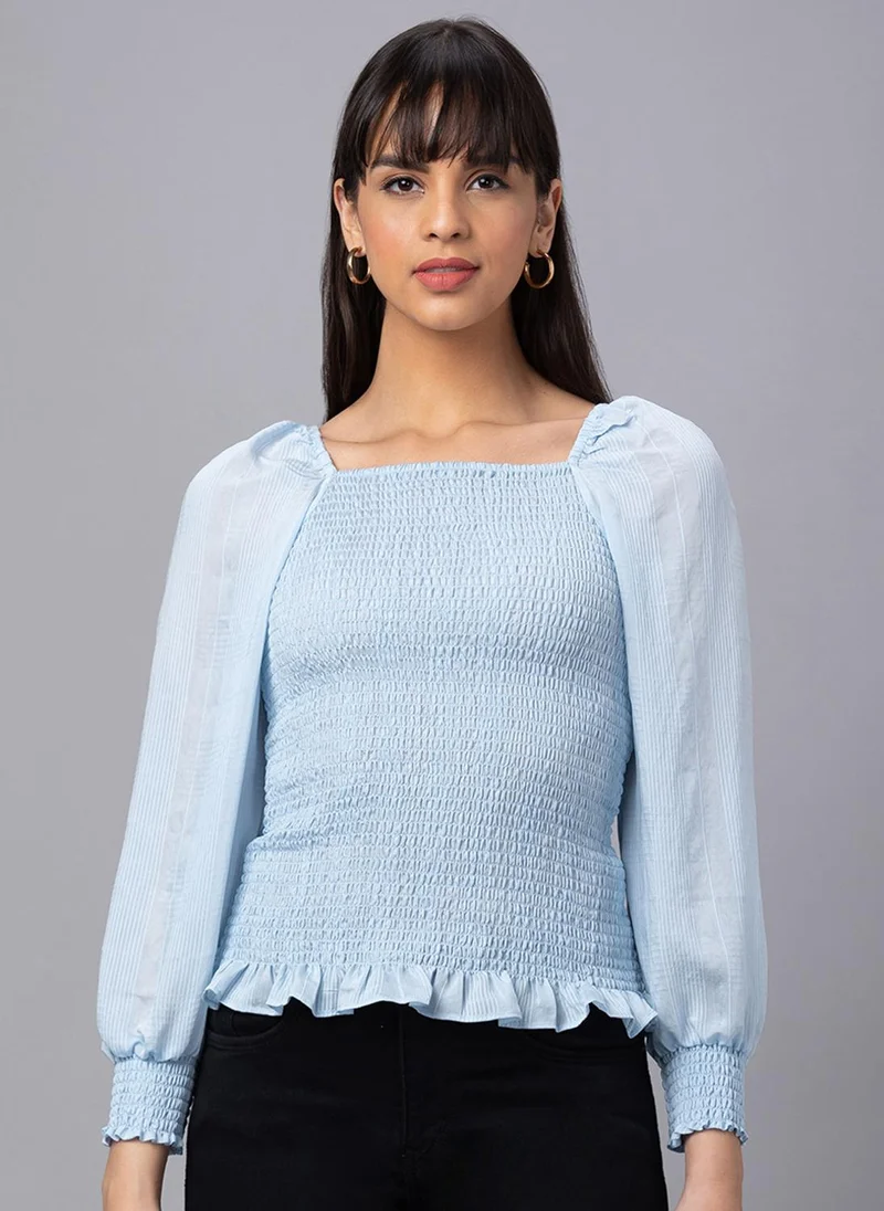 Globus Women Sea Green Puff Sleeves Fitted Crop Top