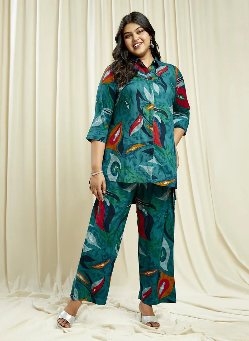 Globus Women Notch Lapel Floral Print Belted Tunic With Mid-Rise Pants Fusion Co-Ord Set
