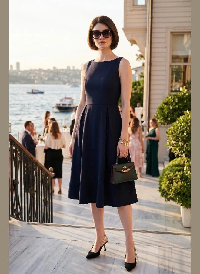 Lela Regular Fit Crew Neck Pocketed Pleated Midi Length Evening Dress Women's Dress 6111963