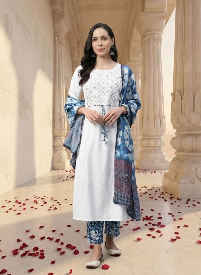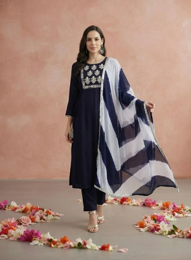 Yuris Women Navy Blue Pure Cotton Kurta with Trousers With Dupatta