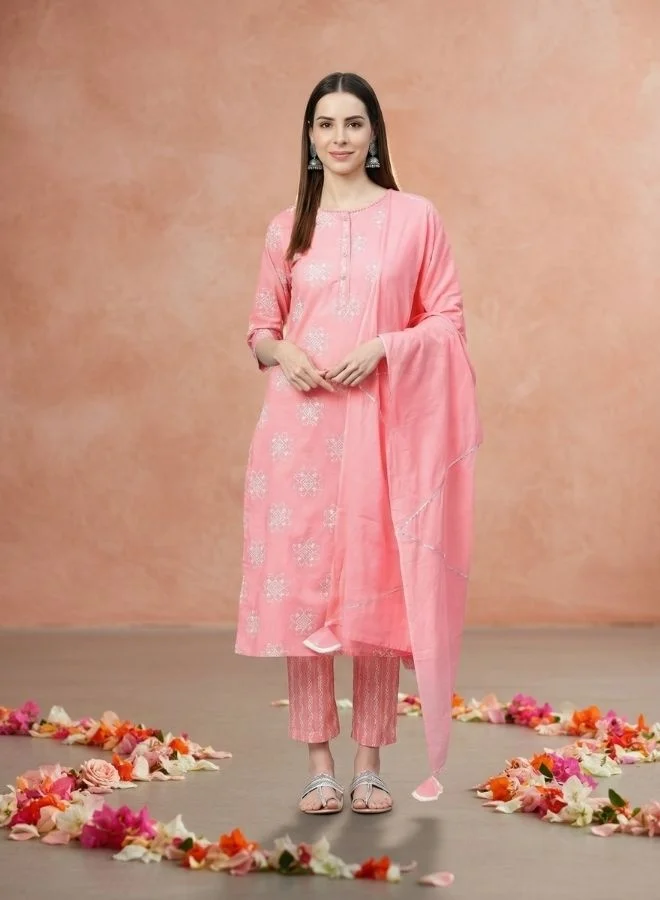 Yuris Women Pink White Printed Kurta with Palazzos Dupatta