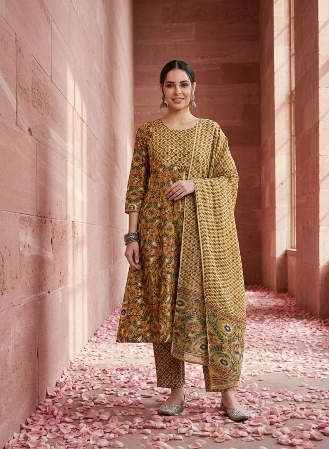Yuris Women Lavender Ethnic Motifs Embroidered Regular Pure Cotton Kurti with Trousers With Dupatta
