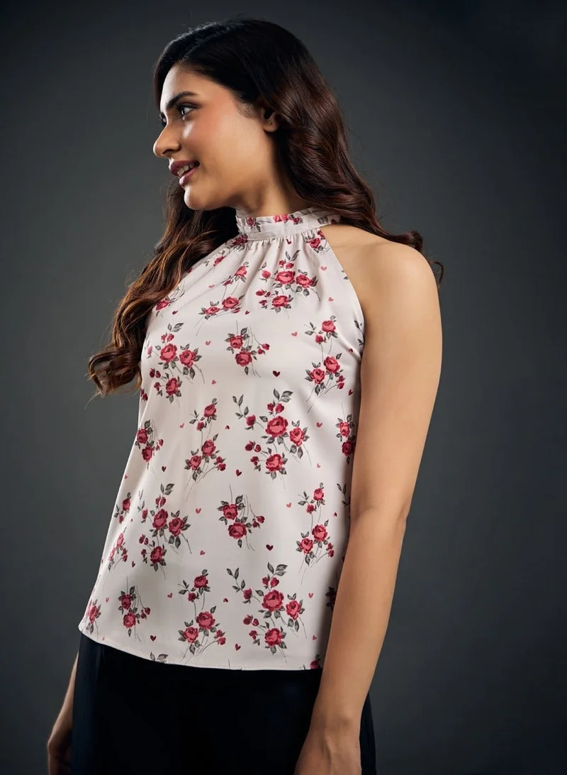 Neck Detailed Long Sleeve Printed Satin Smocked Top