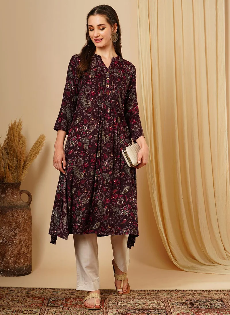 Globus Women Floral Printed Mandarin Collar Pleated A-Line Workwear Kurta