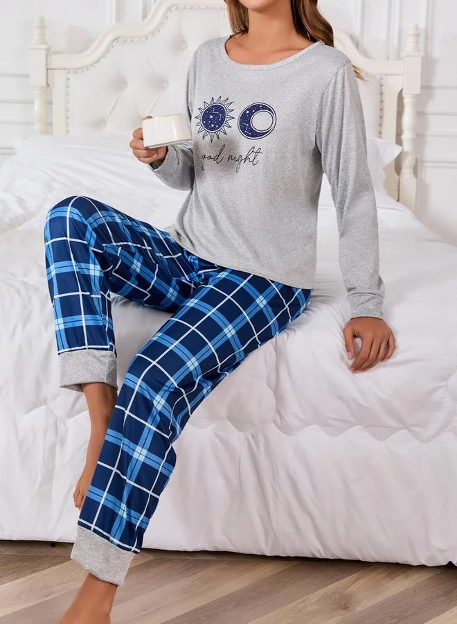 Grey Moon Star Graphic T-Shirt and Checked Pyjama Set