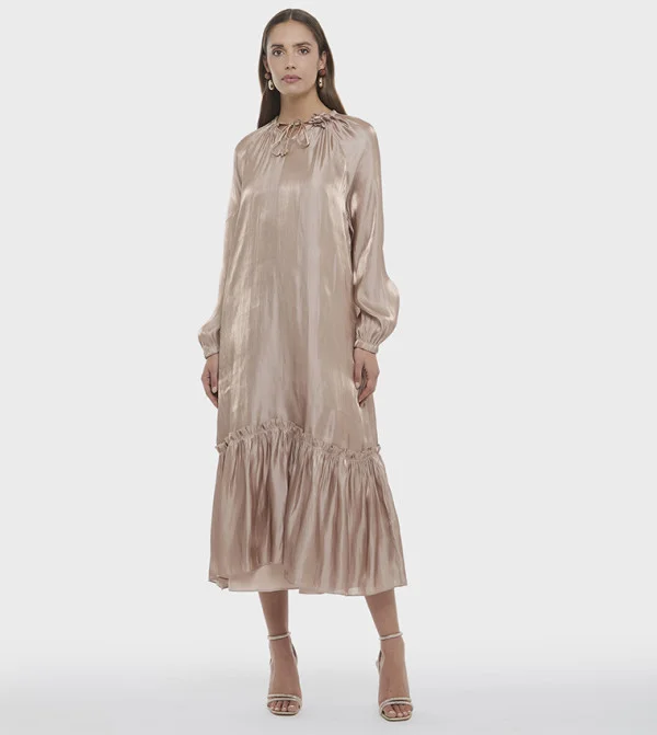 BCBG PRINTED JAQUARD SATIN TIERED LONG SLEEVE MAXI DRESS