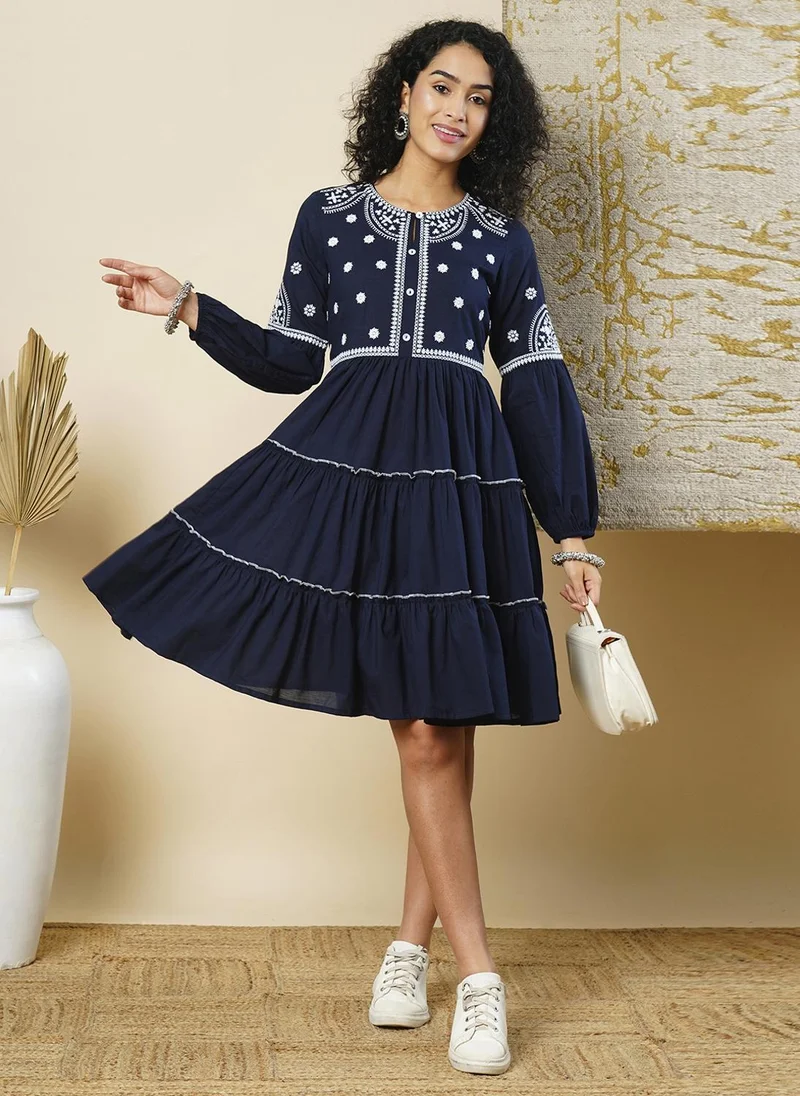 Globus Women Ethnic Motifs Printed Tie Up Neck Fit & Flare Mini Ethnic Dress