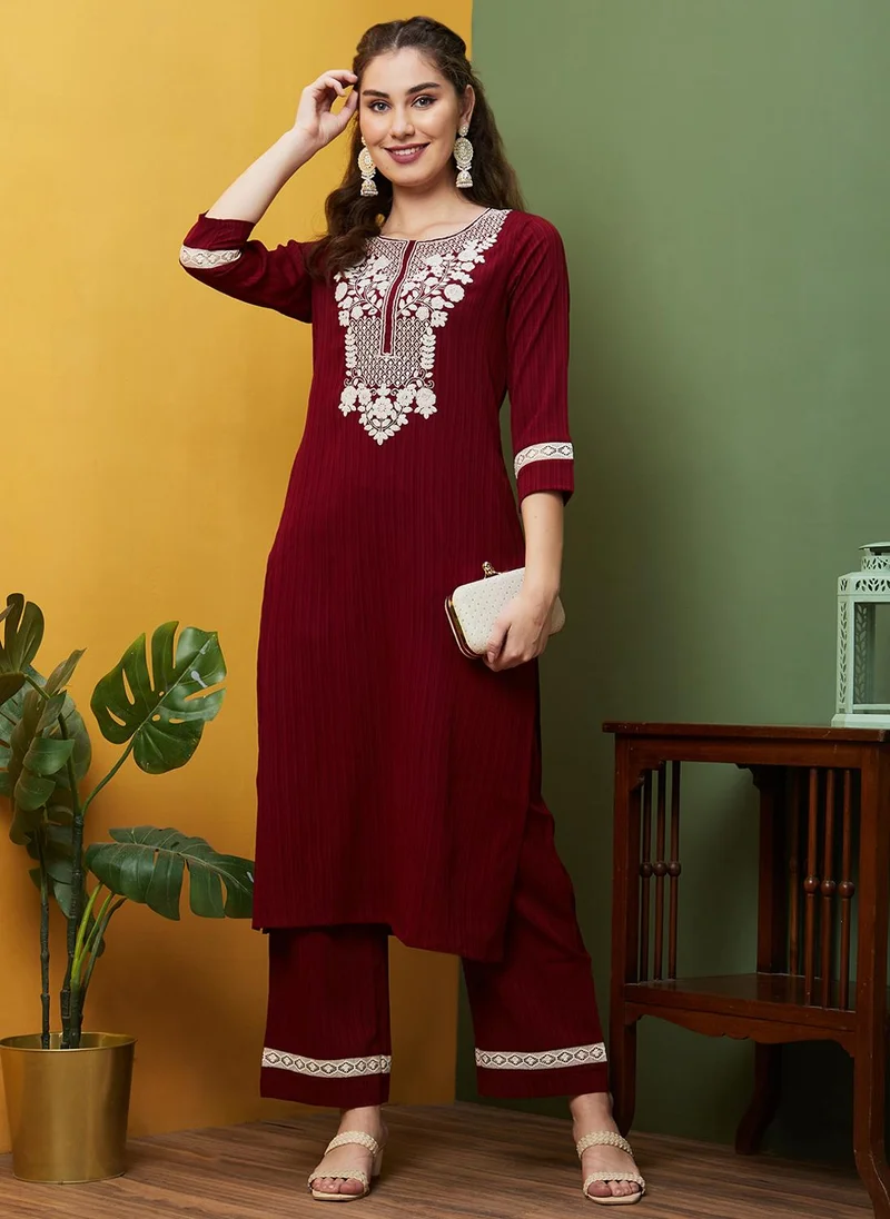 Globus Women V-Neck Embroidered Lace Details Calf Length A-Line Kurta With Pants Workwear Set