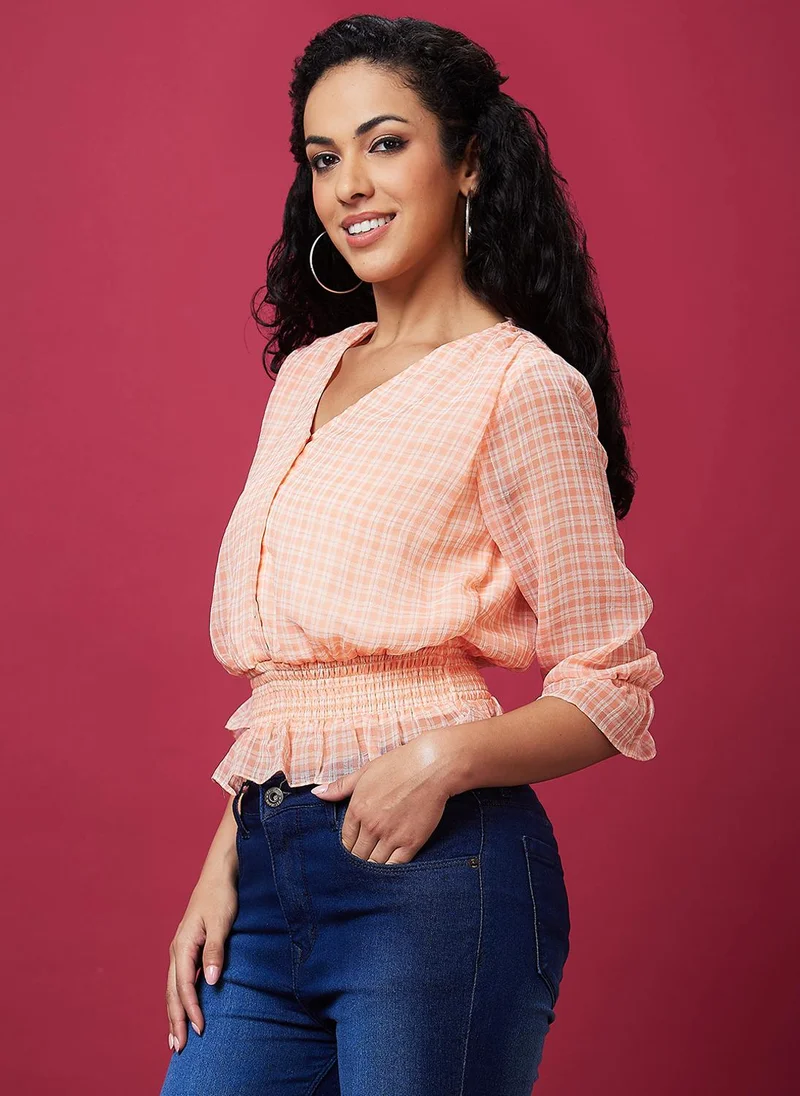 Globus Women Peach Solid Casual Co-Ord Set With Twisted Shirt Style Top & Cargo Shorts