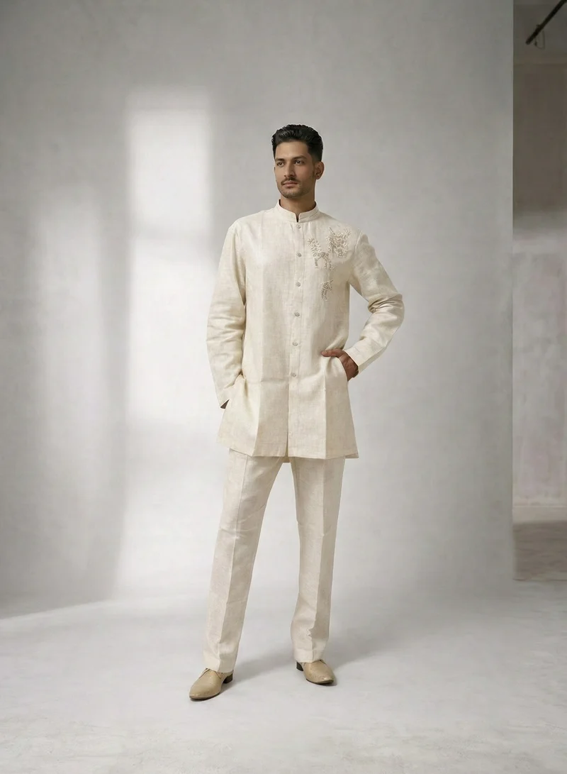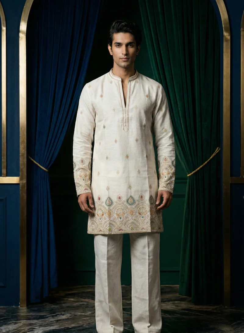 Ivory Linen Kurta Set with Intricate Pastel Embroidery