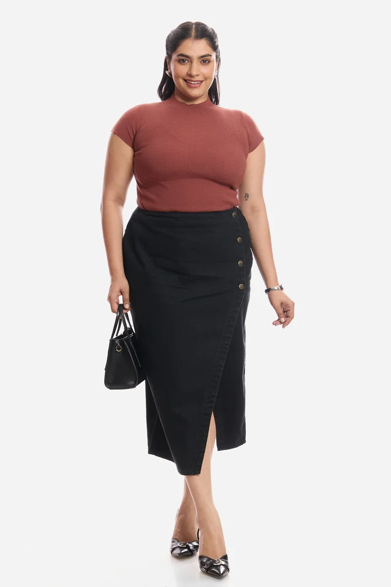 Solid Cotton Assymetric Waist Denim Skirt for Women