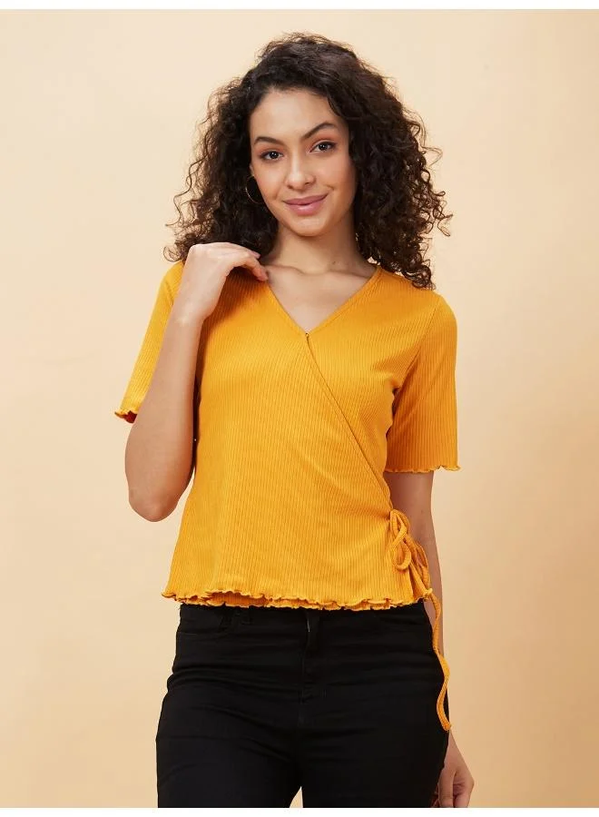 Globus Women Orange Square Neck Woven Puff Sleeve Top