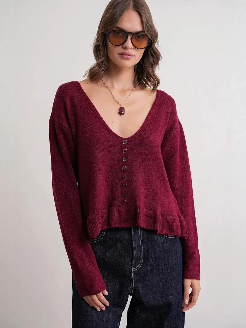 Mixray Buttoned V-Neck Ribbed Knit Cardigan