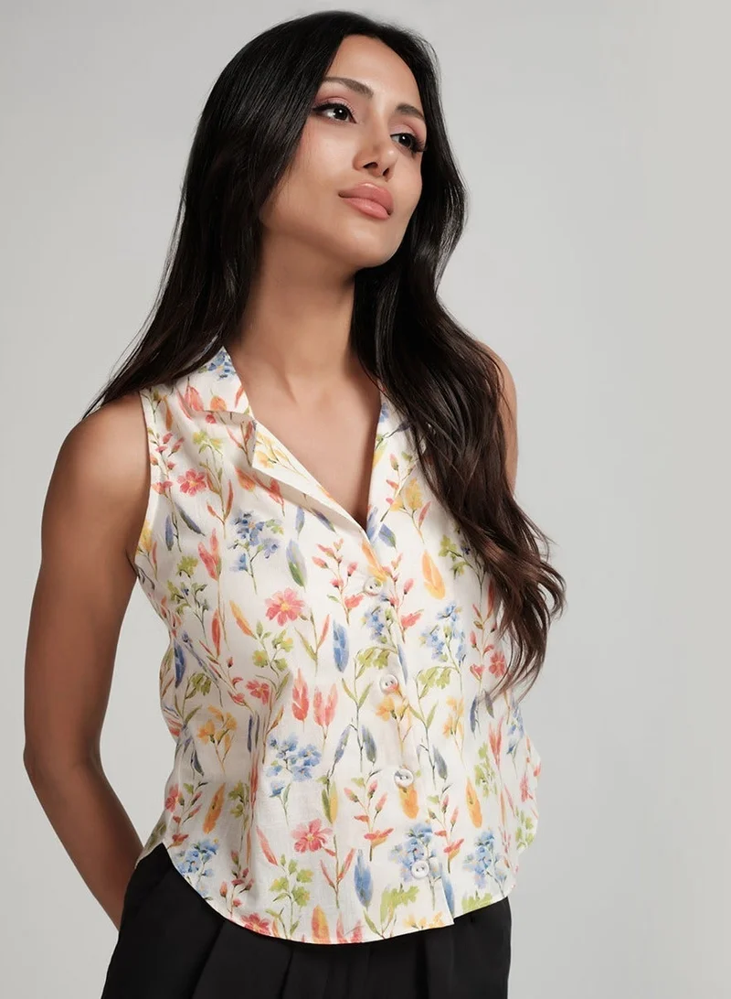 Cuff Detailed Long Sleeve Printed Blue Shirt