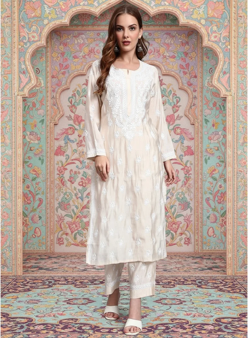 Women Hand Embroidered Lucknowi Chikankari White Modal Kurta Set