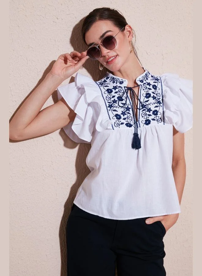 Lela Embroidered Truvakar Sleeve Mandarin Collar Cotton Shile Fabric Shirt Women's SHIRT 611BZ0044